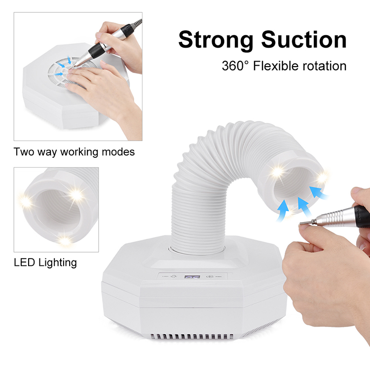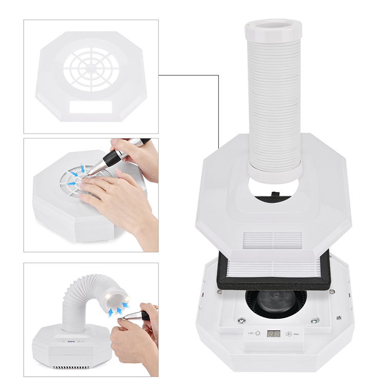 Kini nga nail dust collector nga nasangkapan sa kusog nga power fan, makahatag og taas nga tulin apan ubos nga kasaba. Dual-purpose: square tray ug stretchable tube parehas nga magamit. Ang filter screen dali nga ilisan ug mahimong limpyohan ug gamiton nga balik-balik. Ang stretchable tube nga adunay 3 LEDs, makatabang kanimo sa pagtan-aw sa imong mga kuko pag-ayo ug tin-aw. Kini usa ka kinahanglanon ug propesyonal nga himan nga gigamit sapaggaling sa mga kuko sa tudlo o mga kuko sa tiil.